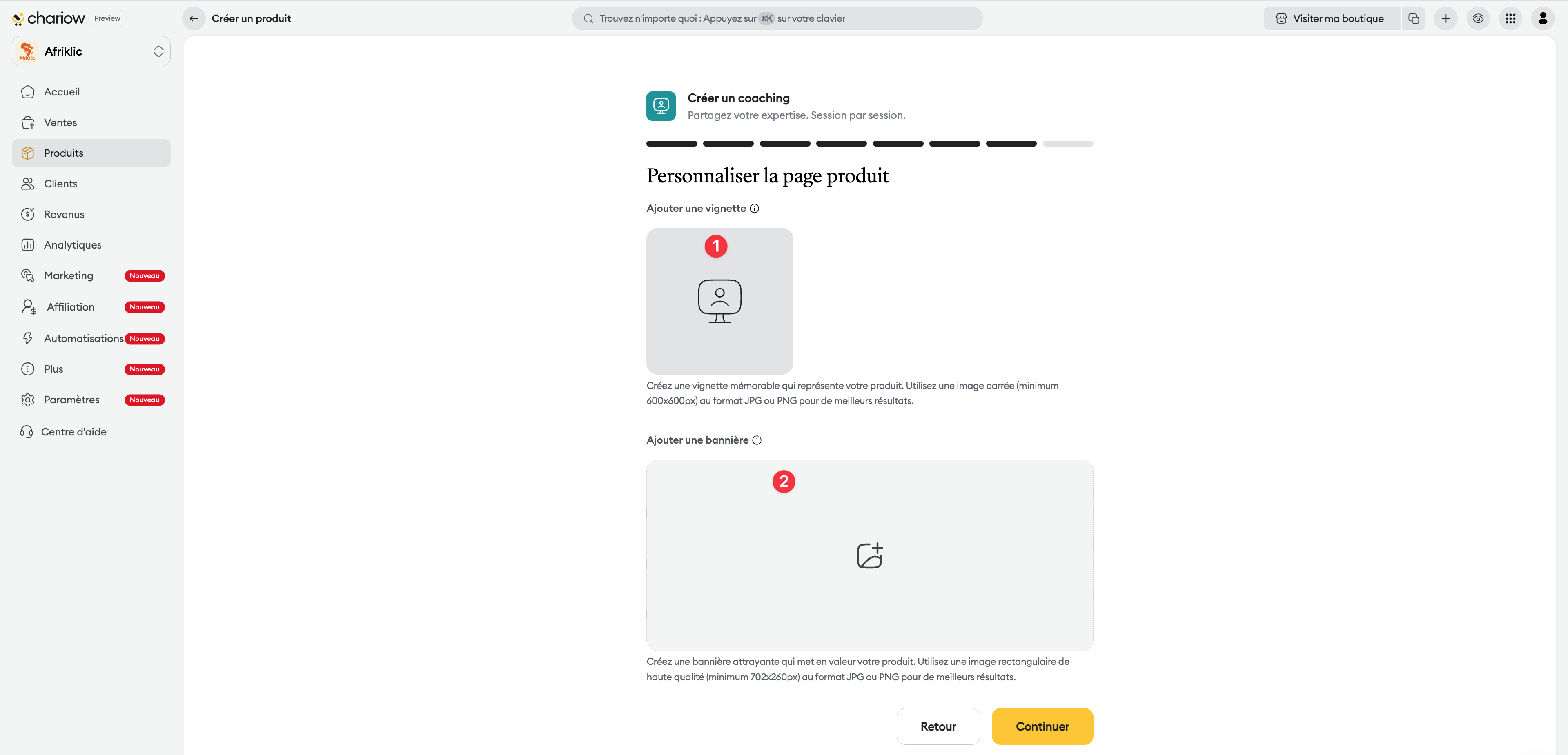 Bannière : Une image rectangulaire de haute qualité qui s'affichera en haut de votre page de vente.