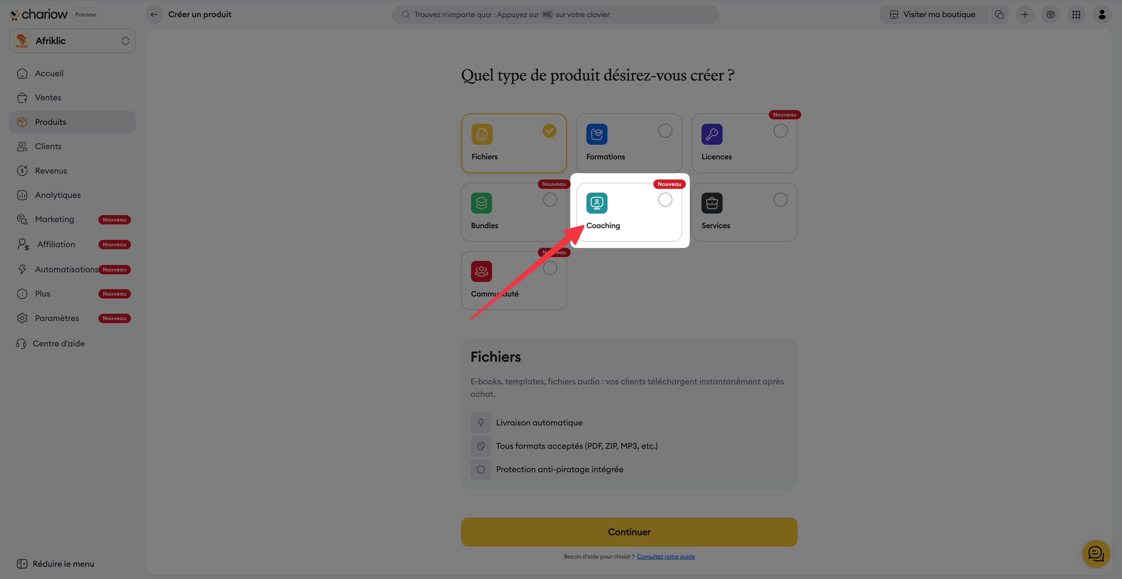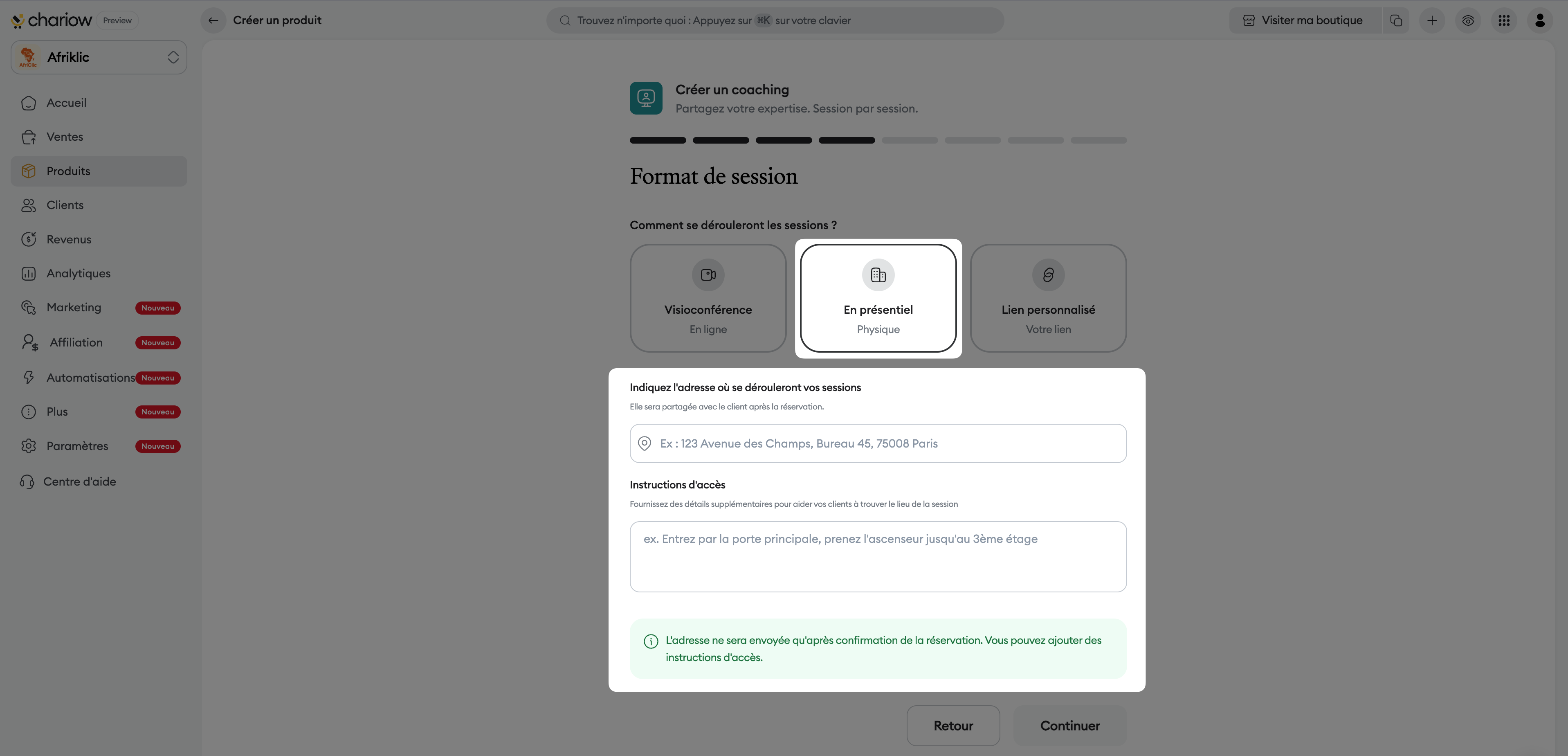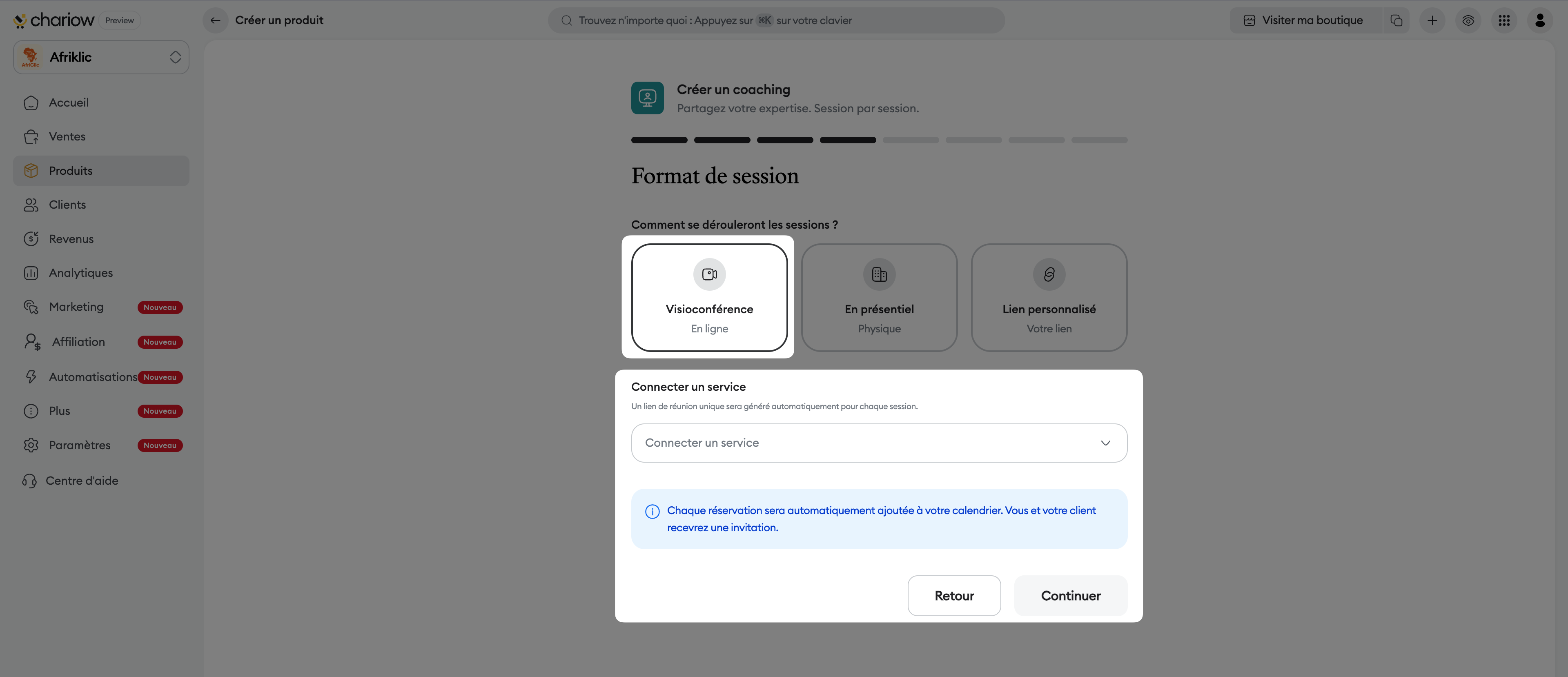 Que vous soyez consultant, formateur ou expert, Chariow vous permet d'automatiser la prise de rendez-vous. Vous définissez vos créneaux, la durée de vos sessions et le mode de rencontre (Visio ou Présentiel), et la plateforme s'occupe de la vente et de la synchronisation de votre agenda.