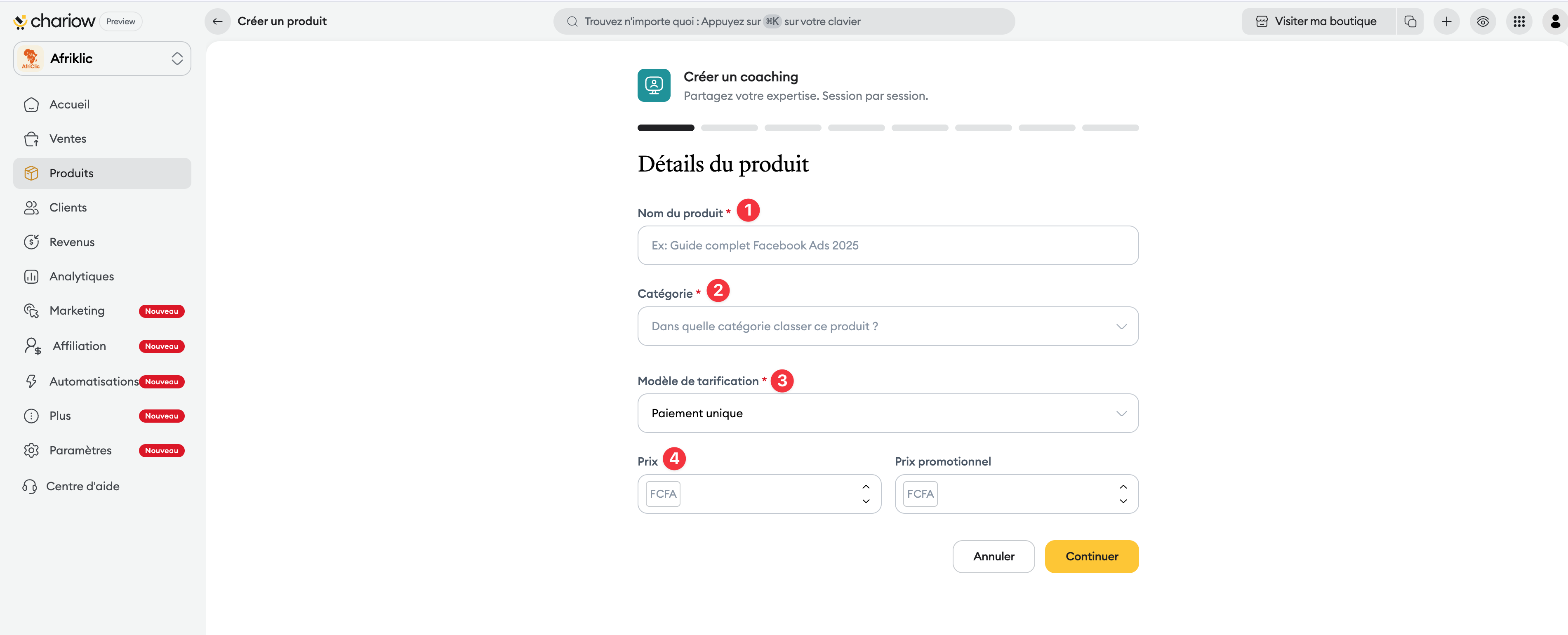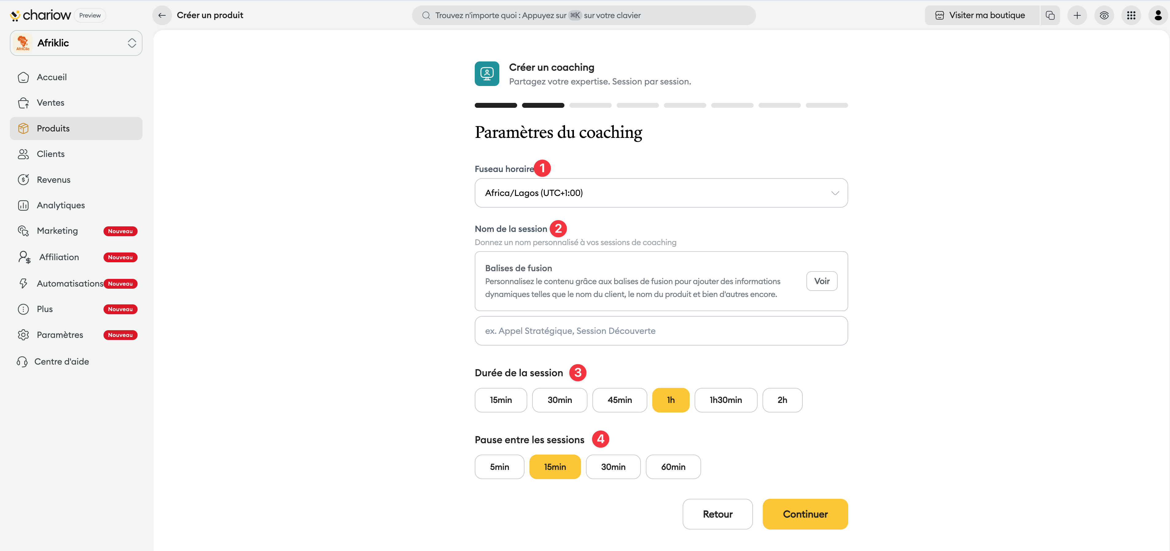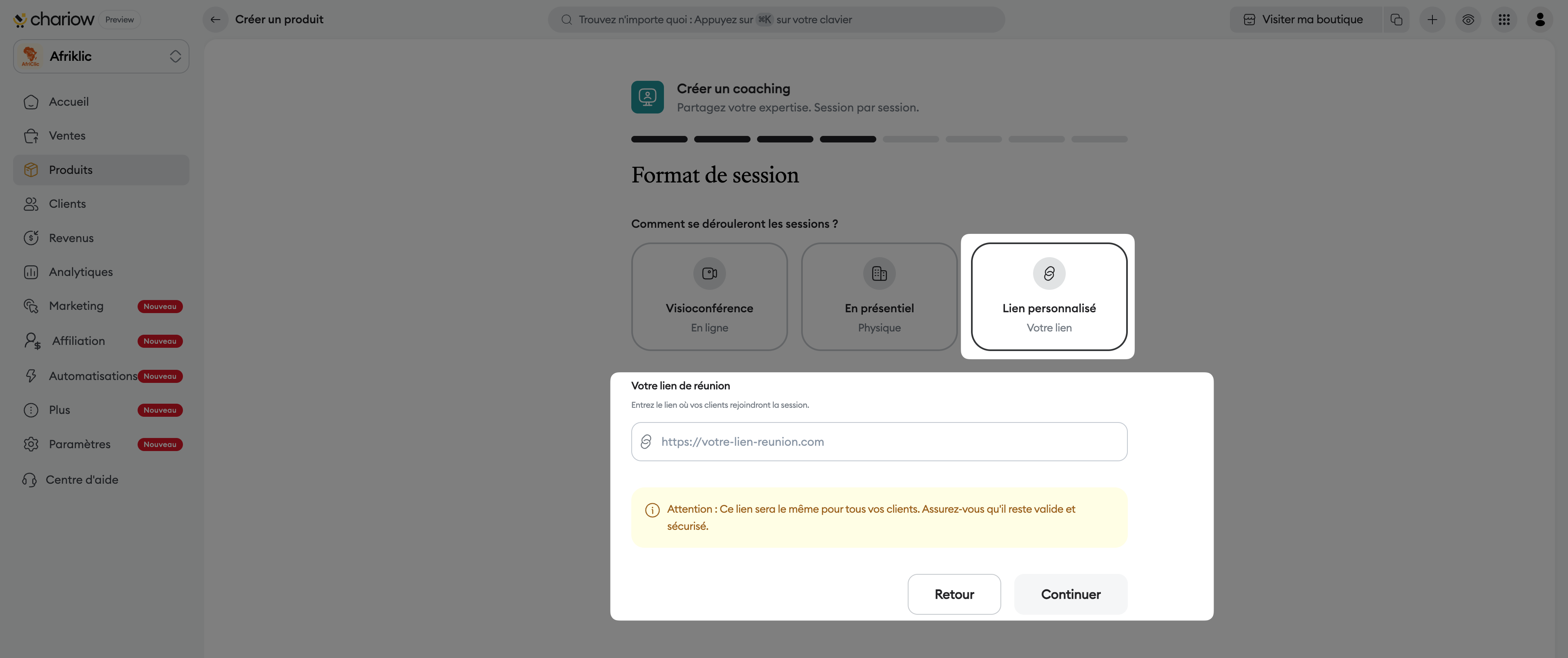 Nom du produit : Donnez un titre clair à votre session (ex: Coaching Business Stratégique).