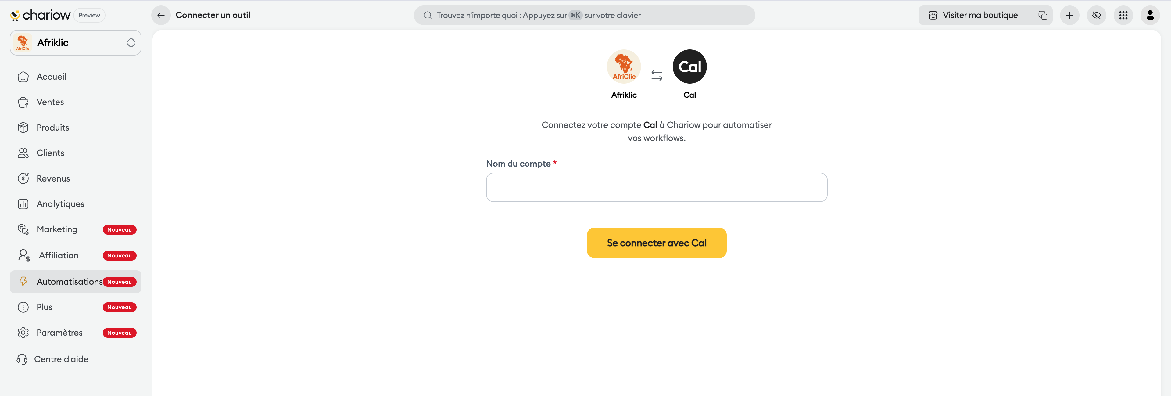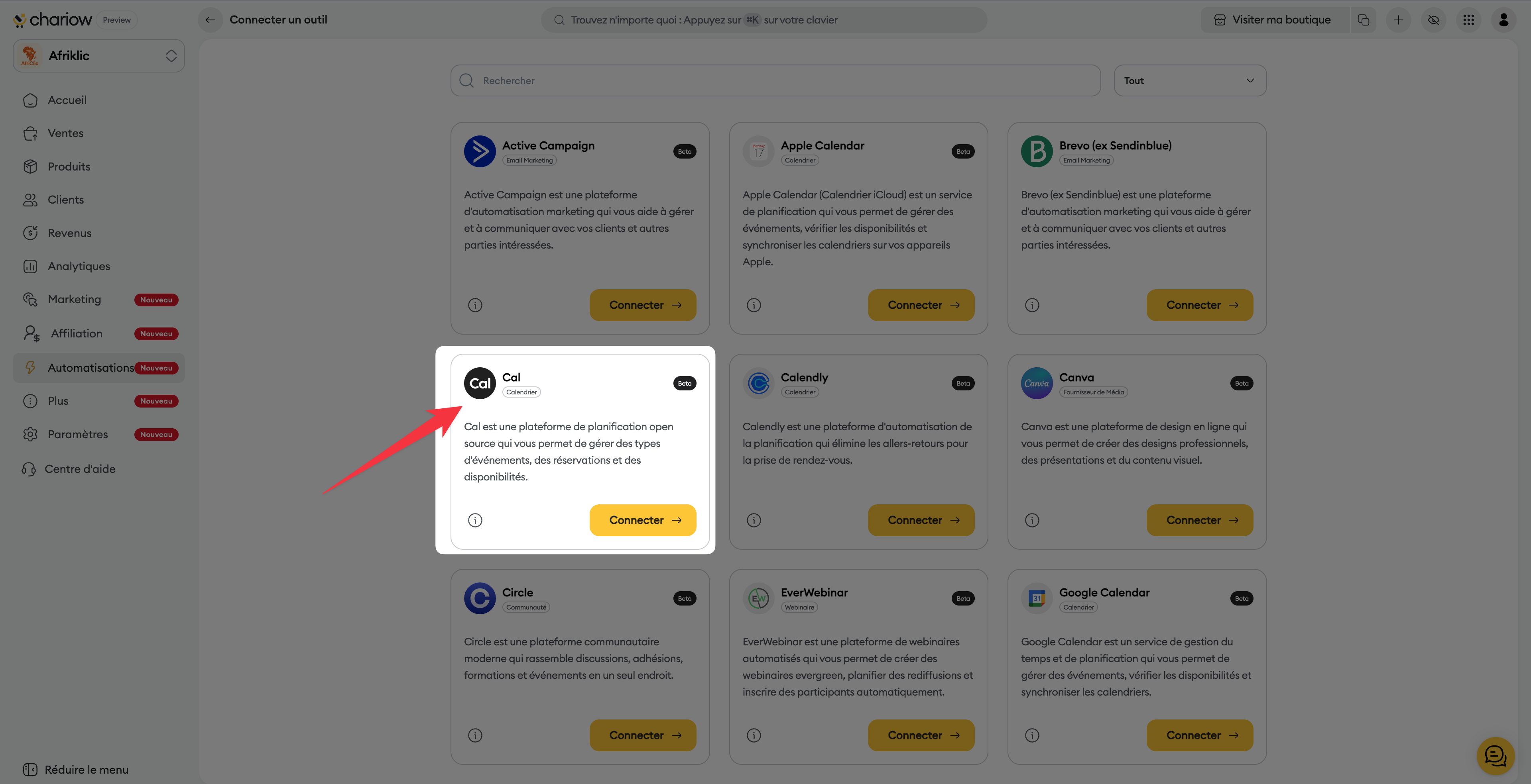 Connectez-vous à votre tableau de bord Chariow. Dans le menu latéral de gauche, cliquez sur l'onglet "Automatisations", puis sélectionnez "Connecter un outil" en haut de la page.
