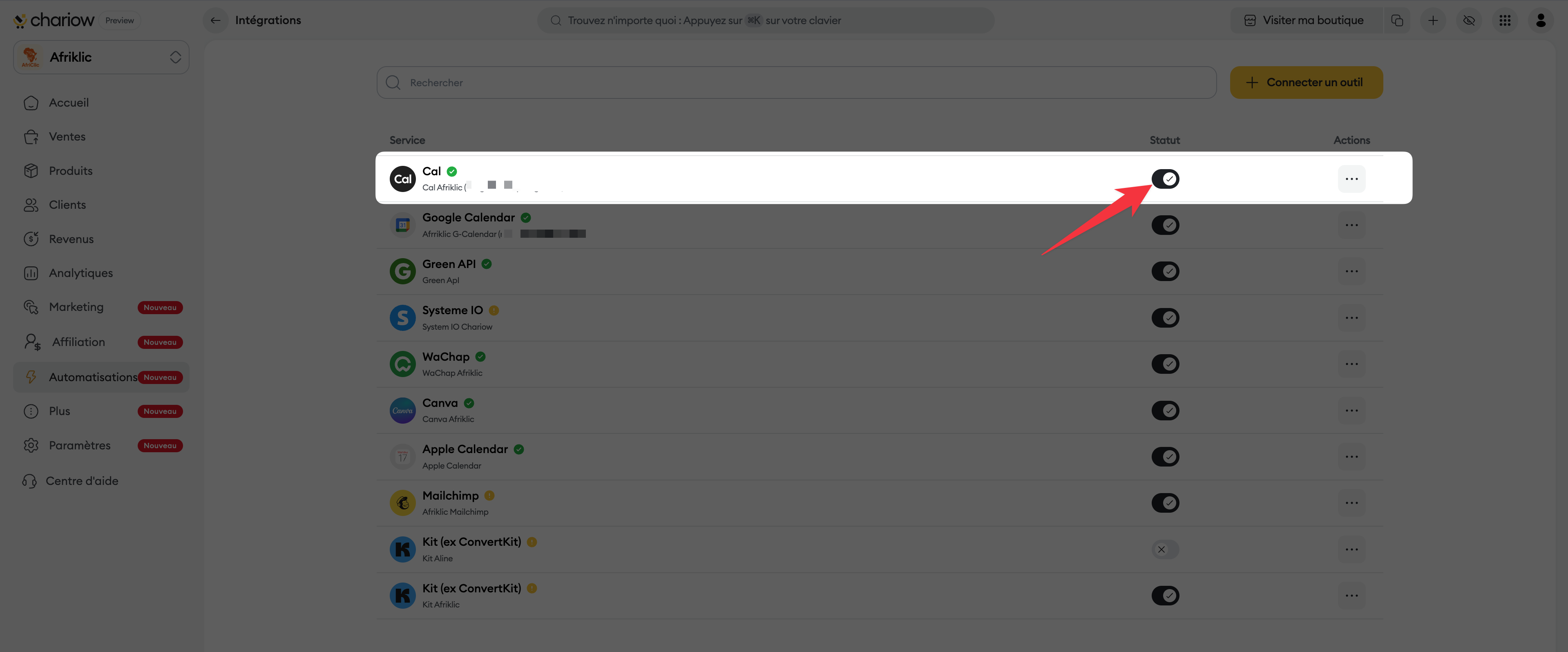 Une fois l'autorisation validée, vous serez redirigé vers l'onglet "Intégrations" de Chariow. Vous devriez voir "Cal" apparaître dans la liste des fournisseurs avec un statut activé (interrupteur en position de marche).