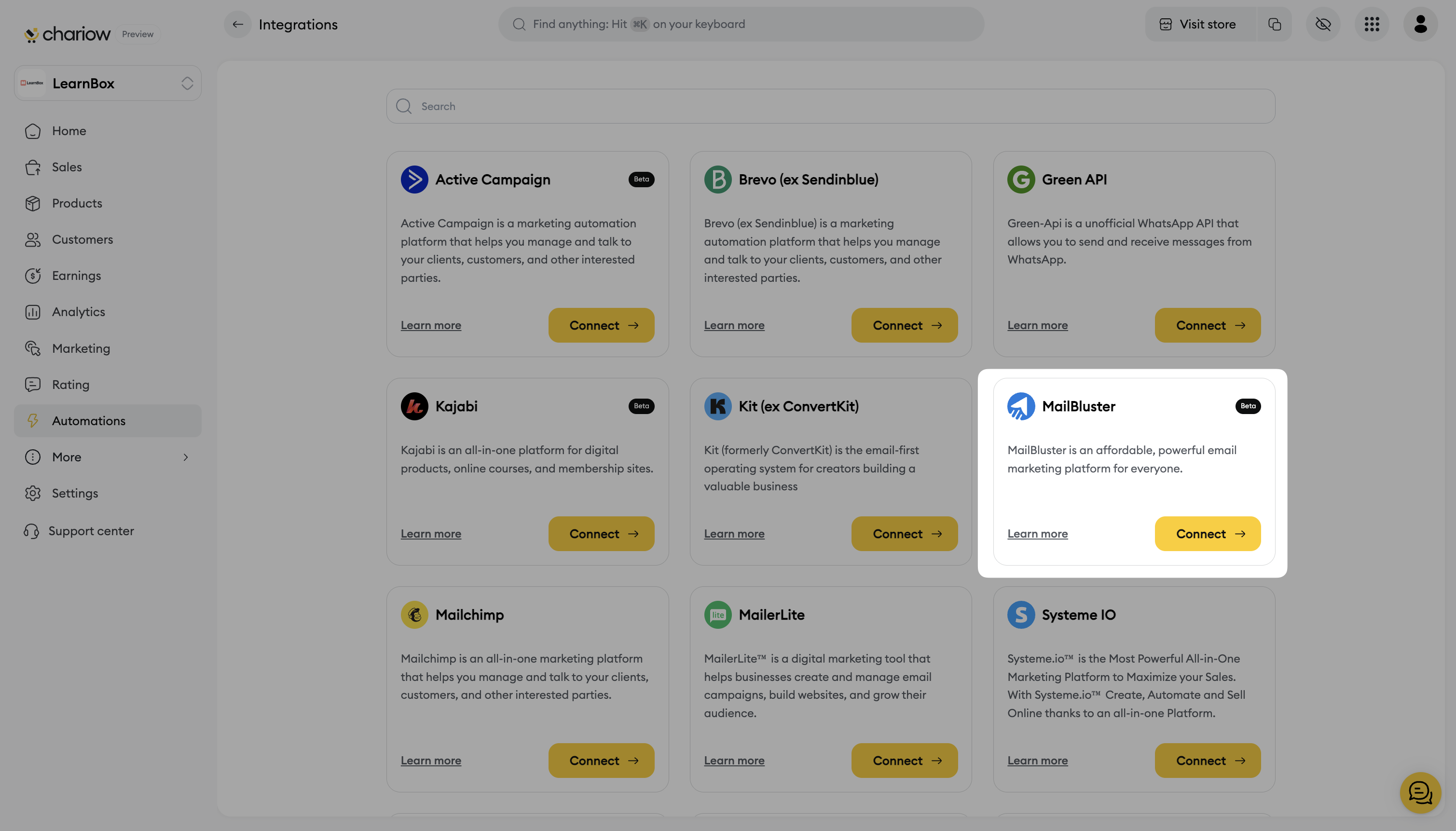 MailBluster is an email marketing solution that helps you send newsletters, manage your contacts, and analyze your campaigns at an affordable cost. By connecting it to your Chariow store, you can automate sending emails to your customers, manage your mailing lists, and track the performance of your communications straight from your automations.